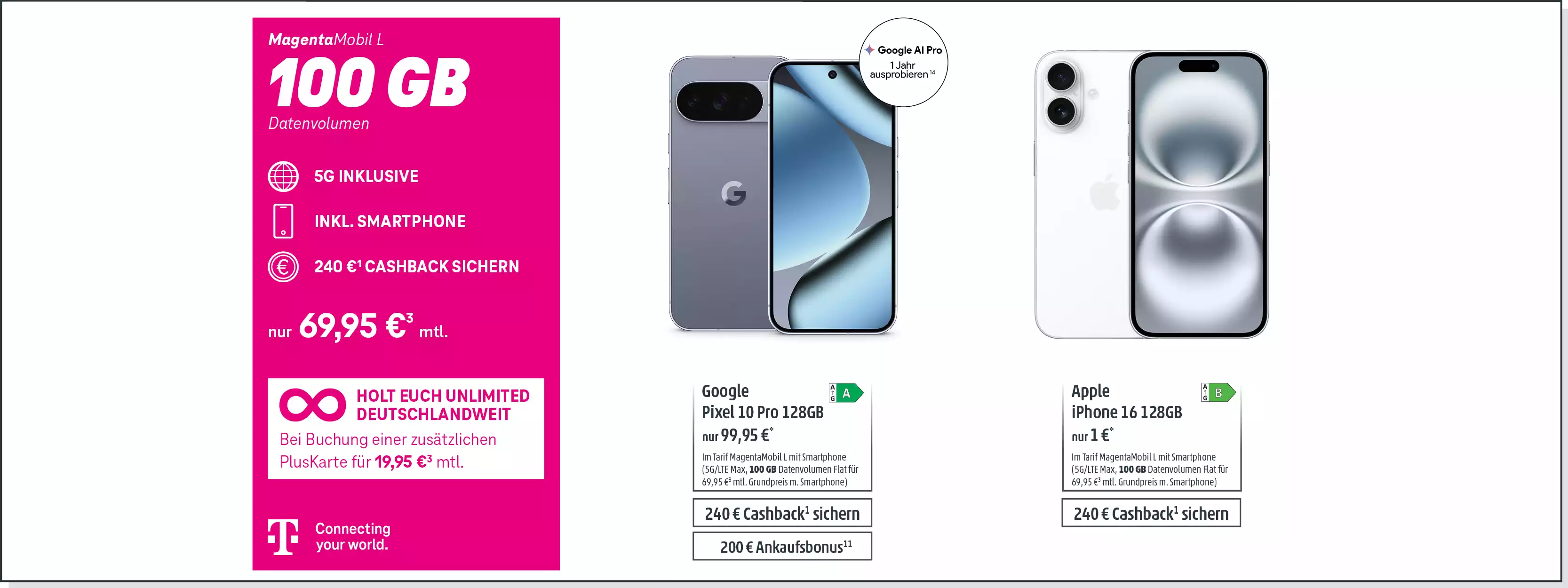 11) Der Ankaufsbonus gilt für private Endkunden ab 18 Jahren bei Kauf eines der im Folgenden genannten Smartphone-Modelle vom 19.09.–31.12.2025 bei der Telekom Deutschland GmbH (TDG) und bei zusätzlichem Verkauf eines teilnahmeberechtigten Smartphones an die Assurant Deutschland GmbH. Das Handy-Ankaufsangebot für das Altgerät muss bis zum 31.12.2025 generiert werden und das Altgerät bis zum 21.01.2026 bei der Assurant Deutschland GmbH bzw. ihrem Dienstleister eingegangen sein. Teilnehmer erhalten ein Ankaufsangebot für das Altgerät, zzgl. eines Ankaufsbonus. 150 € Ankaufsbonus gibt es beim Kauf eines Google Pixel 10 und 200 € Ankaufsbonus beim Kauf eines Pixel 10 Pro oder Pixel 10 Pro XL. Das Altgerät muss funktionsfähig sein, d. h., es muss ein- und ausschaltbar sowie entsperrt (kein SIM-/Net-Lock) sein, darf keinen Wasserschaden oder Displaybruch aufweisen und muss einen Mindestankaufswert von 1 € haben. Teilnahme mit max. 3 Aktionsgeräten pro Haushalt. Solange der Vorrat reicht. Ausrichter der Aktion ist die Telekom Deutschland GmbH, Landgrabenweg 149, 53227 Bonn, Deutschland. Die Teilnahmebedingungen sind unter telekom.de/handyankauf einsehbar. Ein Angebot von: Telekom Deutschland GmbH, Landgrabenweg 149, 53227 Bonn.