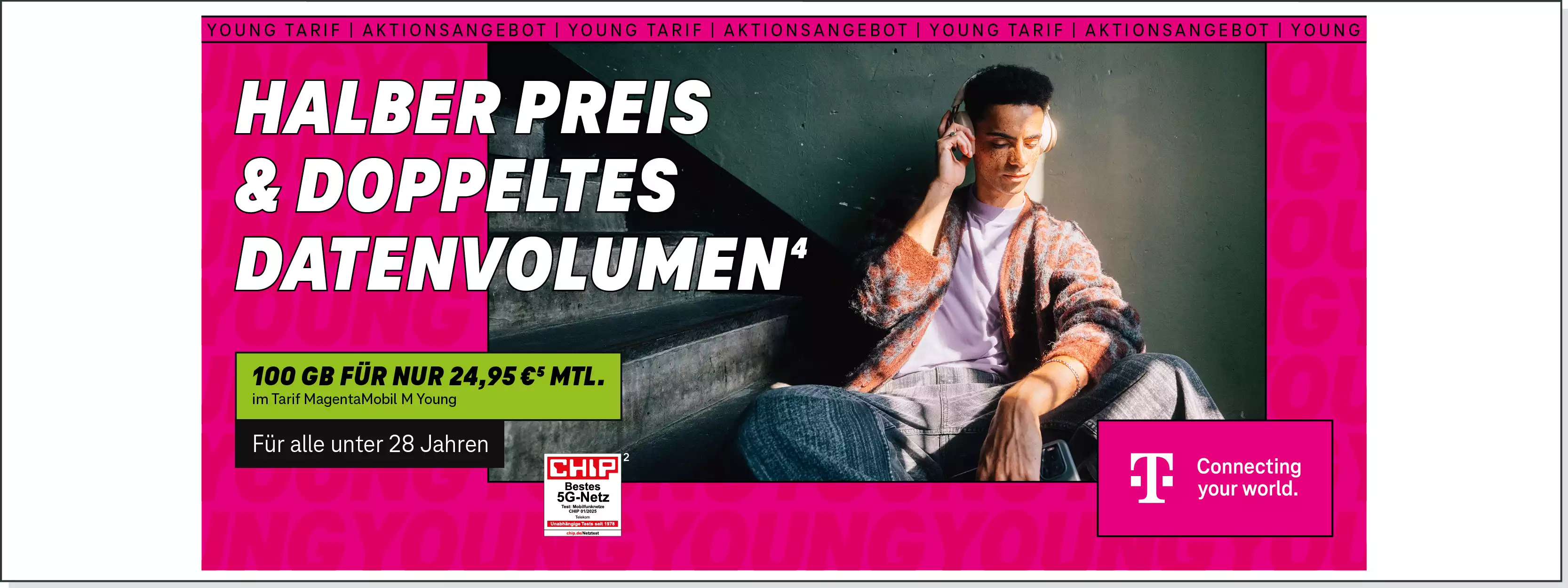 4) 50 % Rabatt auf den monatlichen Grundpreis und ab Magenta-Mobil M Young doppelt so viel Datenvolumen wie in den regulären MagentaMobil Tarifen (ohne Young-Vorteil). Beispiel: MagentaMobil M (ohne Young-Vorteil) mit 50 GB für 49,95 €/Monat, MagentaMobil M Young mit 100 GB für 24,95 €/Monat.